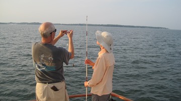 Brooke likes a 2 oz. weight, and two number 4 hooks. He suggests synthetic blood worms in resealable plastic pouches. If you have squid, you use blood worms on the bottom hook and squid on the top.
