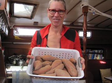 We’re (finally) running low on sweet potatoes. We left Deltaville with a bushel of potatoes. When they’re farm-fresh, they keep well. We’ve had months of meals from a $13.00 bushel of potatoes. Good deal.