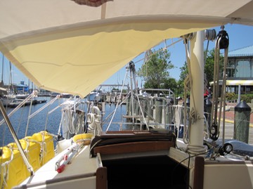 When we had the dodger and bimini made, CA asked Dan at Wavestopper Dodgers to add some extra zippers in the bomini. She made the starboard-side sunshade which zips onto the bimini and provides ample cooling shade for the aft cabin.