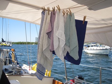 Sometimes the shore dryers aren’t very good. And there’s a line. So we take damp laundry back to the boat to use the CA’s patented Low-Cost Solar Drying System™ to finish the Solar Drying Process™.