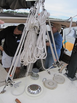To beat, a single block-and-tackle amidships is fine. As they fall off, a second block and tackle can be added to fine-tune the boom.