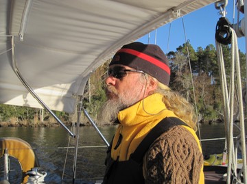 When we reached the Neuse, we had to turn SW and run dead downwind. We’re just awful at sailing downwind.