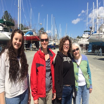 Took some of the family — Niece Hjördis, CA, Sis Nancy, Mom Judy — to see Red Ranger on the hard at the boat yard.