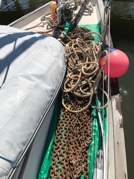 Our locker has about 100′ of ⅜ HT chain, another 150′ of rope that’s the primary rode. On the other side is another 150′ of rope with maybe 20′ of chain that is our first backup.