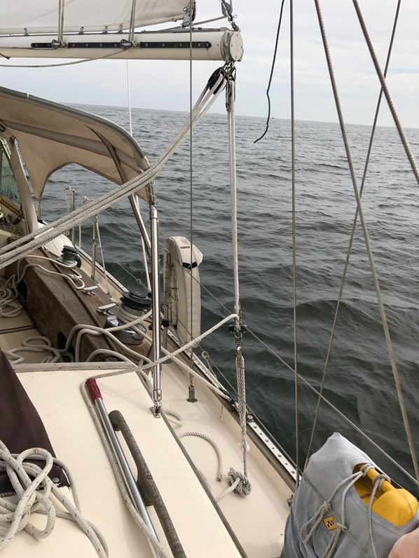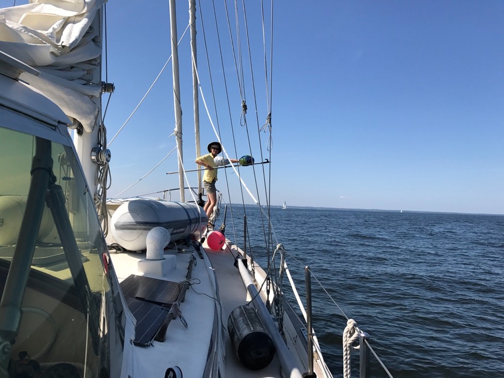 Another important Red Ranger first was raising the main. This does sound a little crazy. It’s true that ketches handle well under heads'l and mizzen: we call it the the jib and jigger rig. I’m talking about something else on this trip. For the past eight years, we’ve used the engine to hold Red Ranger into the wind when raising the main. We’ve read about using the mizzen for this, but never actually tried it before. With light breezes and plenty of room to maneuver in the Choptank, it turns out that the mizzen does better at steering into the wind than CA does.