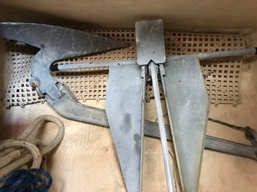 On the right is a Danforth. We’ve used these on other boats. They weigh nothing, and are kind of fun in that respect. But… There are places where Danforths are supposed to be ideal. As it is, it’s just spare. We’d use it if nothing else seemed to grab.