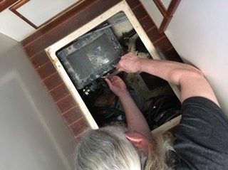 We also replaced the old through-hull fitting that was part of the air conditioning we removed. We’re waiting for the plastics guy to fill the two holes with solid FRP plugs, glass over, prepare, and paint the openings. All of that requires a stretch of warm weather.