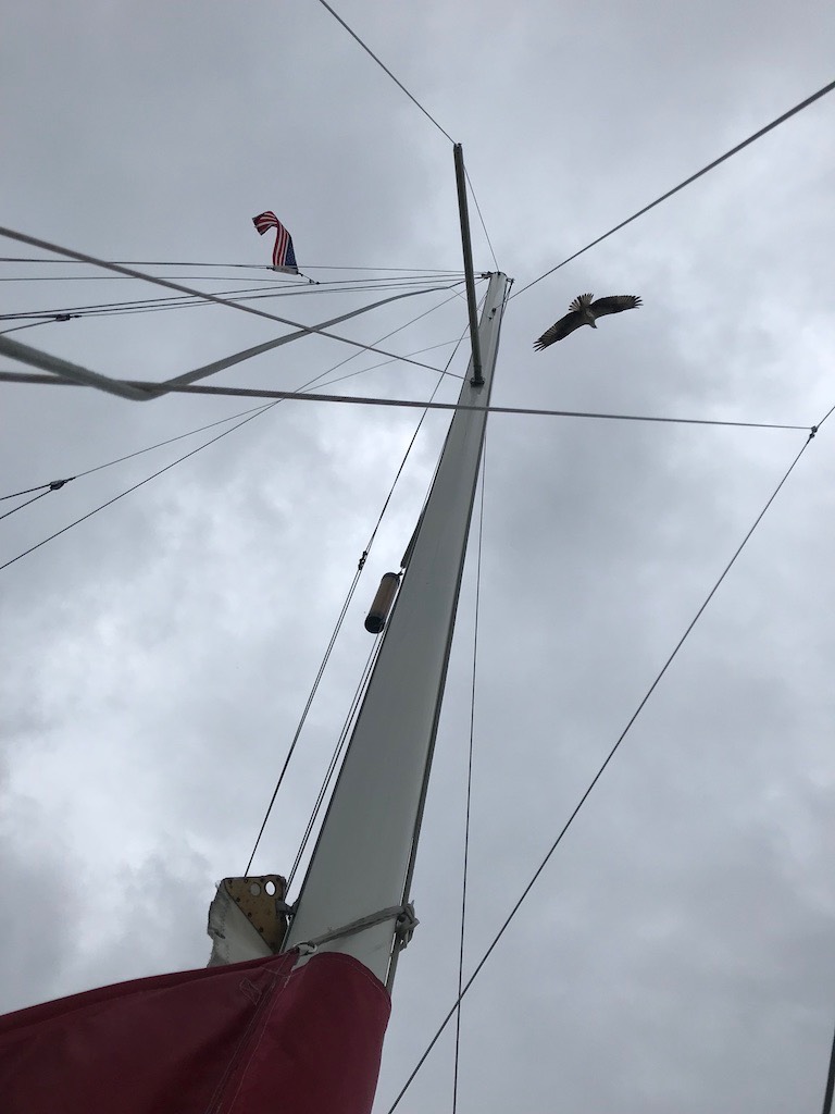 This was an Osprey with a fish, looking for a place to settle down and enjoy a meal. It tried the top of the mizzen mast a few times, but didn’t stay with us.