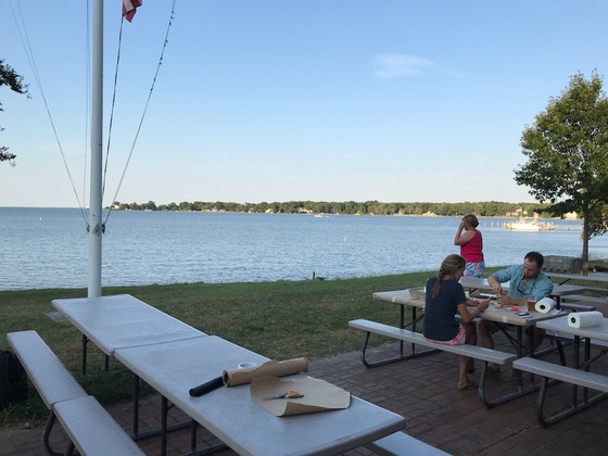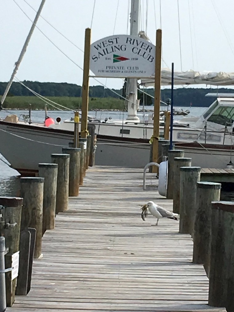 After stuffing our faces with crab, slaw, corn, more crab, and cake, we spent Saturday night at the West River Sailing Club dock. Did I mention the crab? There was a buffet with chicken, pork, hot dogs, and a green salad with roasted eggplant.