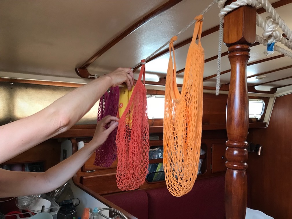 Three mesh bags hanging from ¼” line. Since the handles are loops, a sheet bend works really well to position the bags.