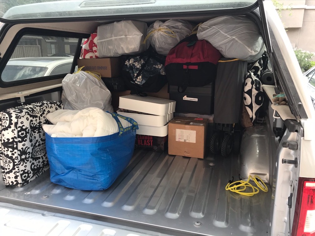 - Roll up the futon and see if we can jam it into the truck. We think there’s room, but this is a big unknown. If it fits, we can also put in the table and chairs.