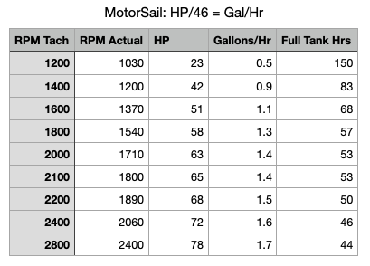 This gives us a range of options. The best case is a fair wind, the fuel tank hours are infinite. The motor-sailing case is 50 hours. The worst case is 24 hours under power because it’s wind-on-the-nose.