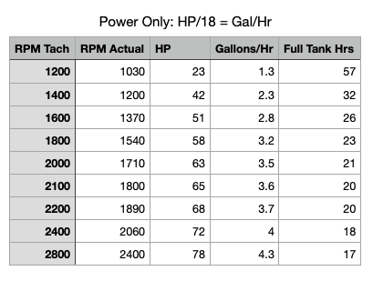 The diesel system is a well-understood transformation from pounds of fuel to horsepower and torque. Indeed. It’s 0.4 pounds of fuel per hour per horsepower (about 18 fluid ounces.) 59 HP is 3.25 gal/hr.
