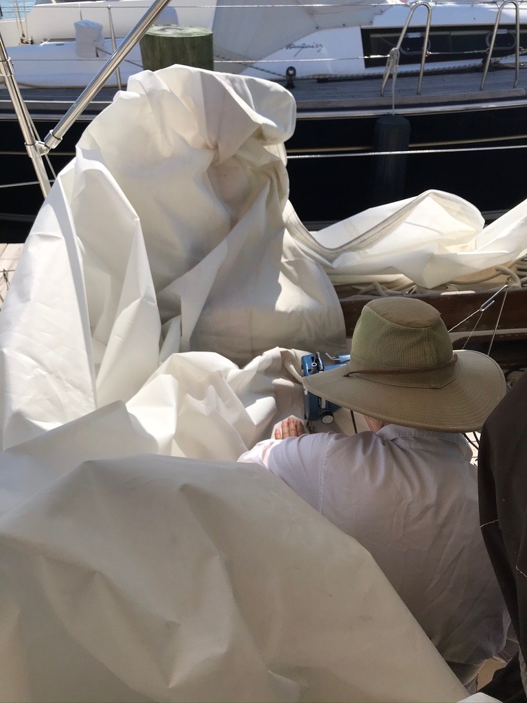 The yankee required restitching the sacrificial panel. Most of the panel is still in good shape. The threads had started to fail. So we staged all 49’ or so feet of yankee in the cockpit and forced it through the SailRite machine.