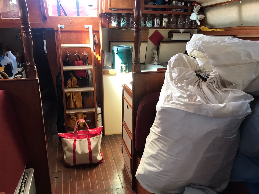 This was my “we’re back home” picture. Sailbags and our canvas tote bag.