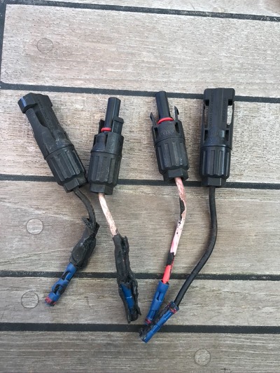 Here are the old connectors that I removed. You can see they’re proper MC4 at one end. The “white” wire was originally red. The red wires are on the wrong gender connector. The outside two are male and usually have positive current flow. The inner two are female and should have been ground.