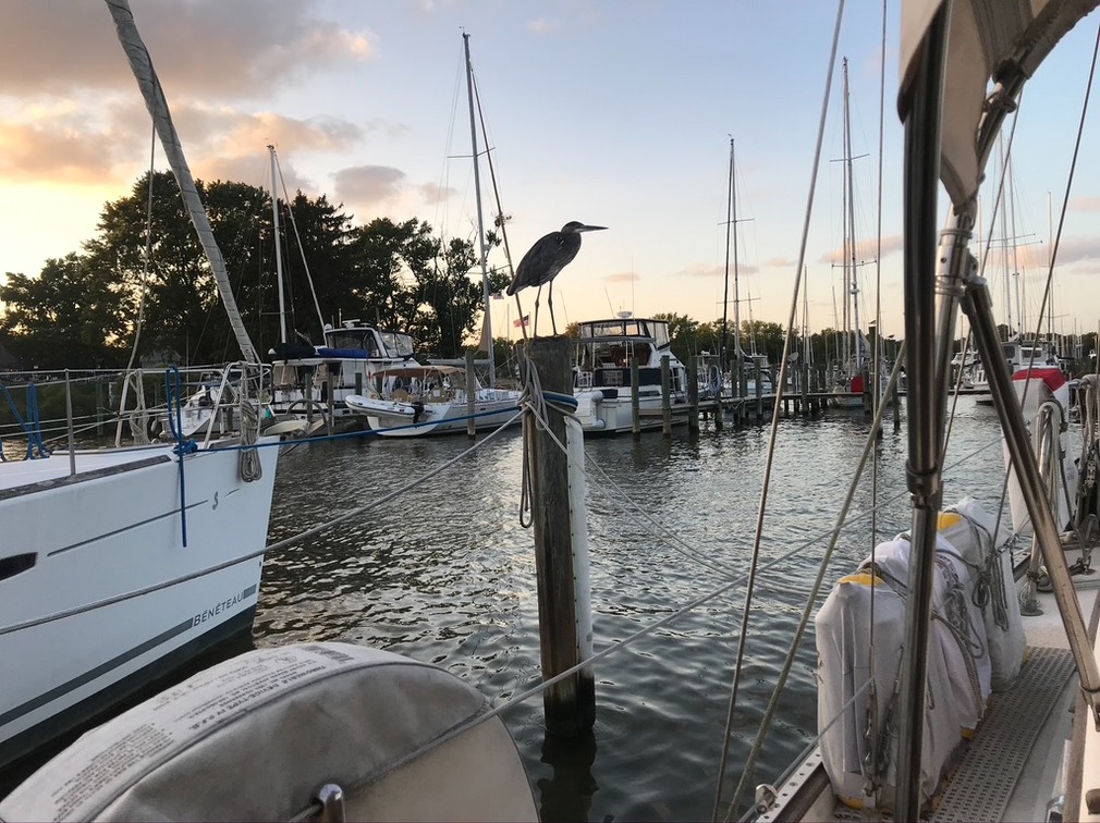 Yes, we have left the dock. Here’s the cockpit, heeled over in 10-15 kt of wind. Beam Reaching down Herring Bay.