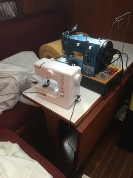 And the means all the sewing machines are in use. A little tiny thing that barely weighs five pounds and does one kind of stitch. And the SailRite LZ-1 which weighs a ton (45 pounds) and can sew through layers of epoxy-impregnated Dacron.