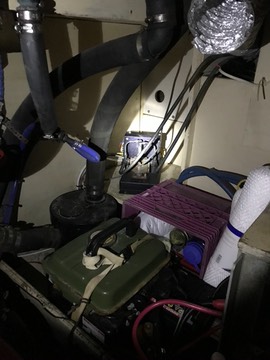 Much Worse. It’s almost inaccessible. It’s behind the muffler (the big black hoses to the left) in the inaccessible corner of the engine room. To even reach it requires climbing over the engine. Looking closely at it? Nope.