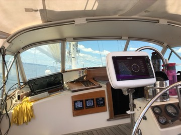 Yes, we have left the dock. Here’s the cockpit, heeled over in 10-15 kt of wind. Beam Reaching down Herring Bay.