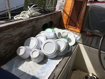 Surprisingly, we have a lot of dishes. Maybe service for six, I think. In addition to the galley, there’s the bar, with yet more glassware to be cleaned and stowed.