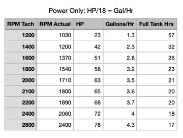 The diesel system is a well-understood transformation from pounds of fuel to horsepower and torque. Indeed. It’s 0.4 pounds of fuel per hour per horsepower (about 18 fluid ounces.) 59 HP is 3.25 gal/hr.