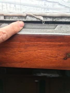 Then there's the light gray lower part of the aluminum frame. A line of new, white bedding compound and finally, the interior teak frame. The black at the bottom is the rest of the boat, cast into shadow by the flash.