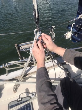 At this point, the size of the triangle seems about perfect, so, the old rope and seized thimble needs to go.