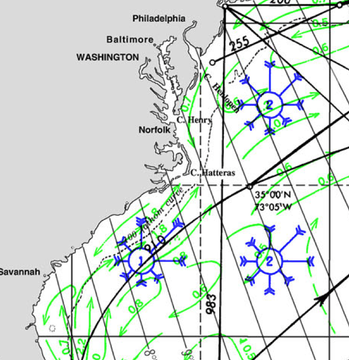 The rose below Hatteras has two interesting features. The long arrow coming from the Northeast tells me the most common wind direction. The 5 feathers tell me the most common wind strength: 5 on the Beaufort scale, which means 17-21 knots. This is very sporty, and suggests we should be carrying nothing more than mizzen and stays’l.