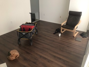 An Ikea Poäng chair, a cart, a computer, and some luggage.