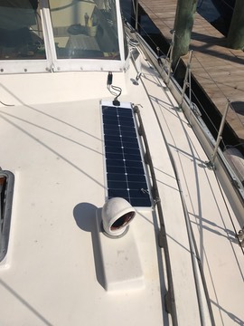 After removing a random pile of solar panels, here’s what we have on the foredeck. Two little 4′×1′ super thin panels. Super thin. Tiny.