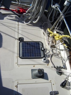 Back to the foredeck. Just in front of the dodger. Under the main boom. Near the wooden grabrails. When the 15W SunForce panel broke, I replaced it with two 24W SunWize semi-flexible panels. In parallel, these can provide a bit over 3A.