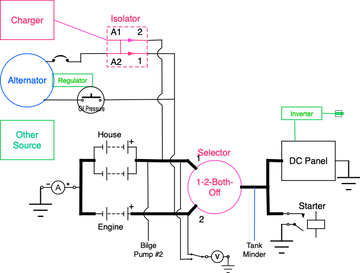 The sketch shows the “House” bank as two parallel batteries. It’s really four 6-volt batteries in series-parallel; this is effectively two 12-volt batteries.