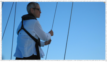 This morning, the wind was delightfully sporty. So sporty, we started out sailing with just stays’l, reefed main and mizzen. We banged along at a good clip.