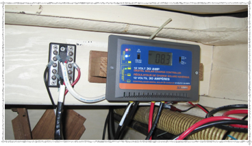 Once the box is on the little frame, it’s a small matter to connect up all the MC-4 on-deck connectors to each other. This forms a cascading series of “Y” fittings among the on-deck panel array. The MC-4 “Y” fittings have little eye holes so they can be cable-tied down solidly. The final connection is made by cutting a 20′ wire in half, putting ring terminals on each half, and connecting the positive and negative to the panel array.