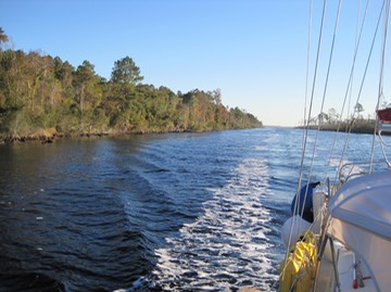 We made the turn, pulled out the Yankee and motor-sailed down the Pungo river for all of an hour. Then we had to put the Yankee away to motor across the Pamlico river.