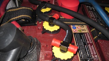 The yellow valves replace the old caps. The “T” fittings with black hoses with red caps join all the cells into a kind of tree structure. Water goes in one and and flows down all the branches of the tree. Once the cells are full, the little float valves stop the water flow. It’s a Flow-Rite Pro-Fill, purchased from www.JanWP.com.