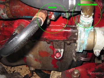 The white splotch under the oil cooler is a salt stalactite where the cooler leaks saltwater and oil. The Ultra big Bronze Fitting is too tall and can’t be screwed down tightly enough. So it’s sealed with handfuls of Permatex.