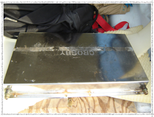 The Crosby was a classic piece of ultra-heavy-duty gear. Red Ranger has an 8 cu. ft. fridge enclosure and an immense 6 cu. ft. freezer section. (Compare with this; what would you do with all that freezer space?) We’re finding that these two enclosures are a bit of overkill for two people. We used a 1 cu. ft. (28 qt.) Coleman cooler to go coastal cruising for 11 days. (See DelMarVa Circumnavigation.)