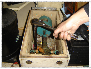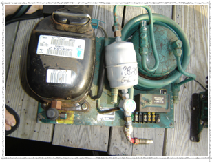 Once we had all the hoses, fittings and wires removed, we could take out the main condenser and the 110V compressor. This was surprisingly heavy and awkward to move.